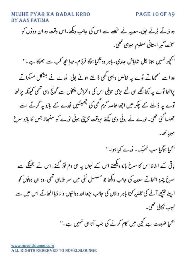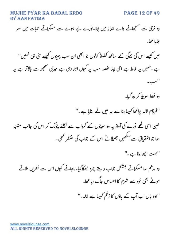 “اب بلکل بھی کام کو ہاتھ مت لگانا جب تک یہ ٹھیک نہیں ہوجاتا اوکے۔” وہ نرمی سے سمجھانے والے انداز میں بولا۔نورے بے ہولے سے مسکراتے اثبات میں سر ہلایا تھا