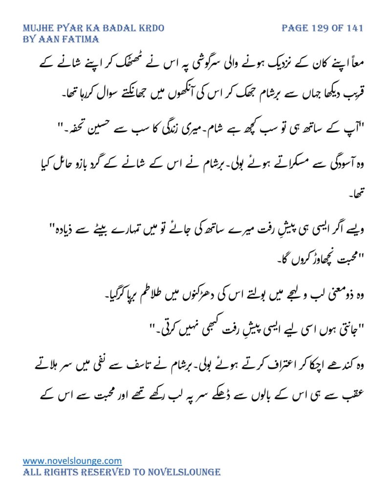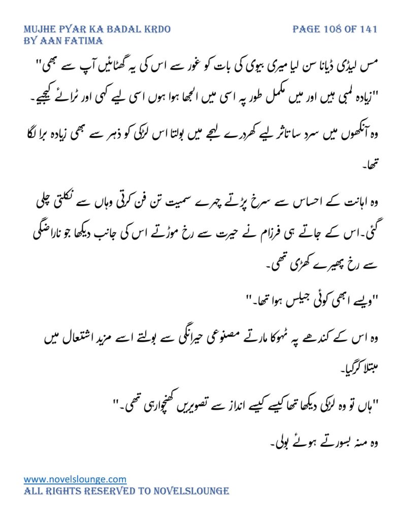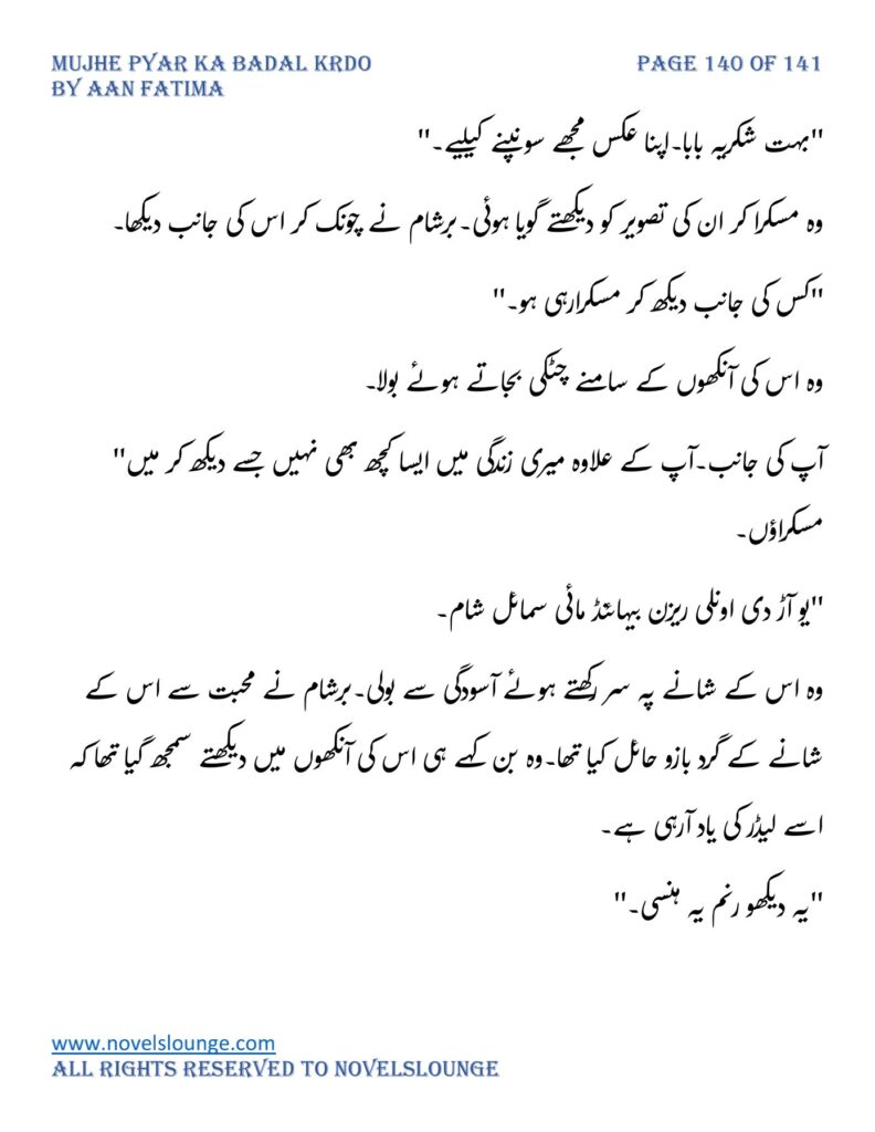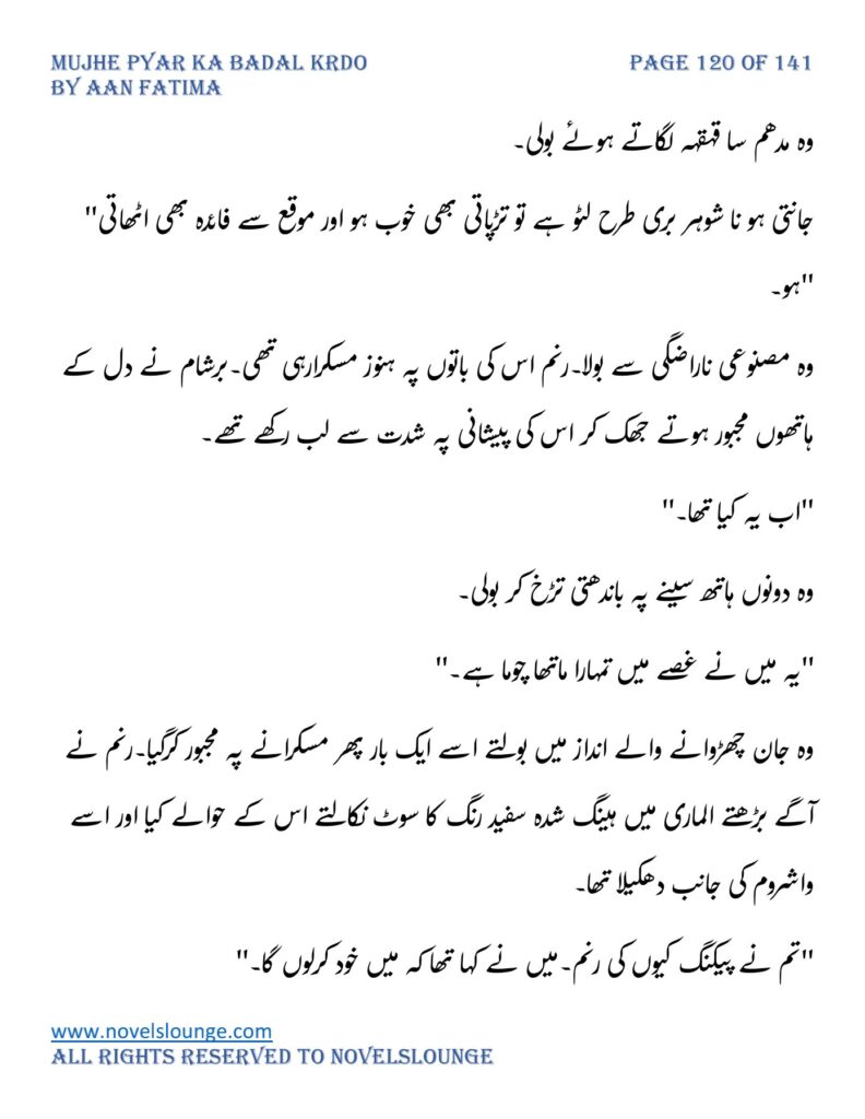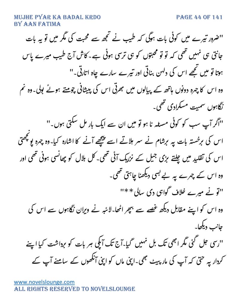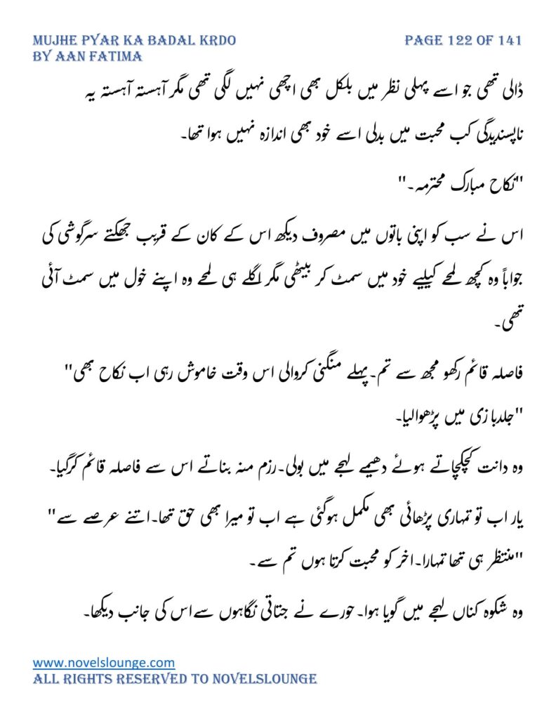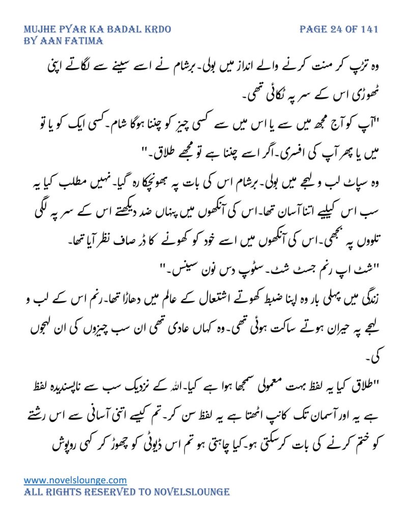 “محبت تو آپ کو بھی تھی ارے نہیں وہ محبت نہیں محبت کے نام پہ دھبا تھا جو آپ نے میرے کردار پہ لگانے میں ایک لمحہ نہیں لگایا اور مجھے حویلی والوں کی نگاہوں میں رسواں کردیا۔میرے کردار کے ساتھ میرے چہرے پہ بھی کالک ملی ہے آپ نے سب کی موجودگی میں۔آپ تو مرد کہلانے کے لائق بھی نہیں ہے۔بس نام ہی مردوں والا کام نہیں۔”