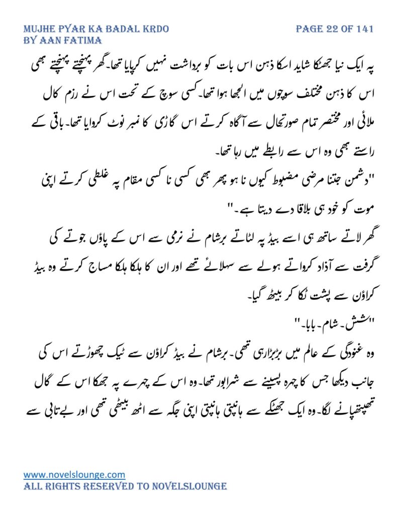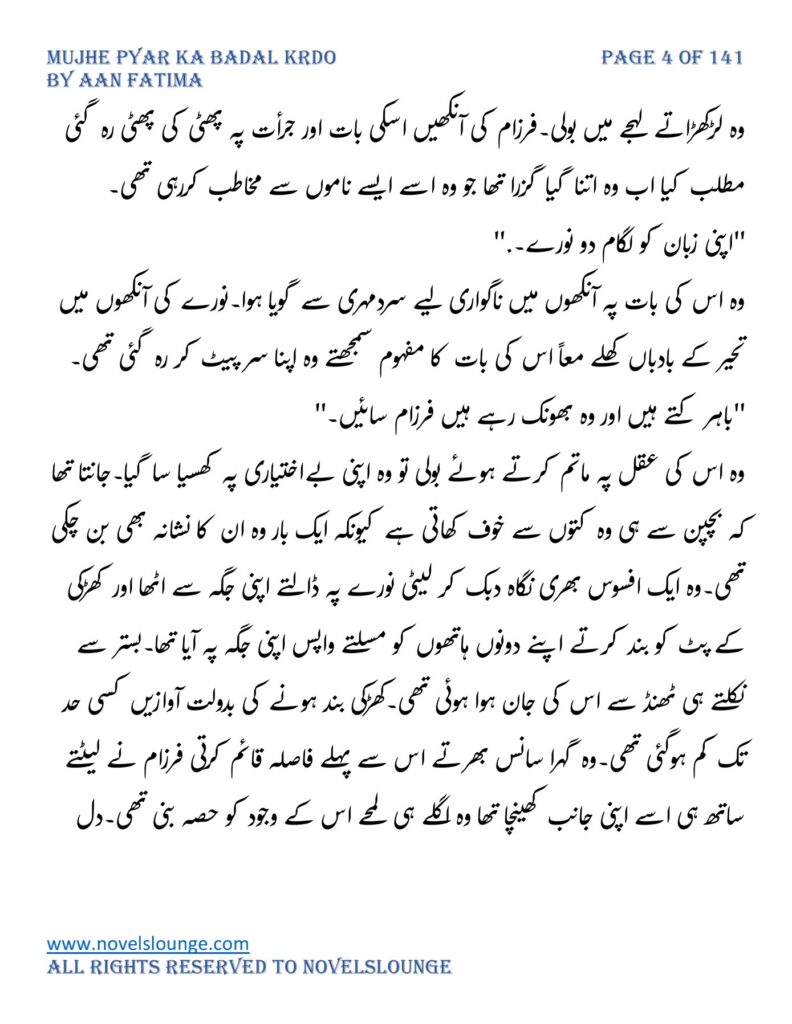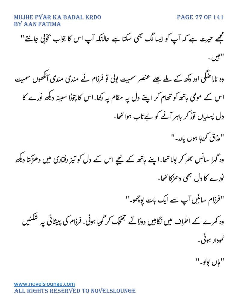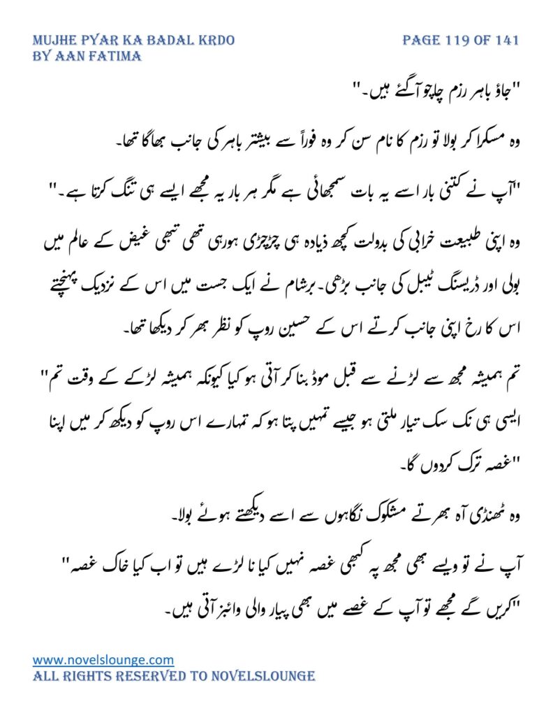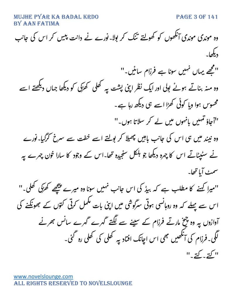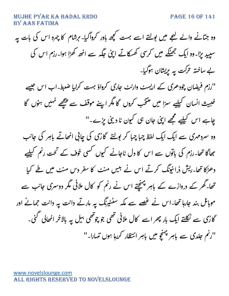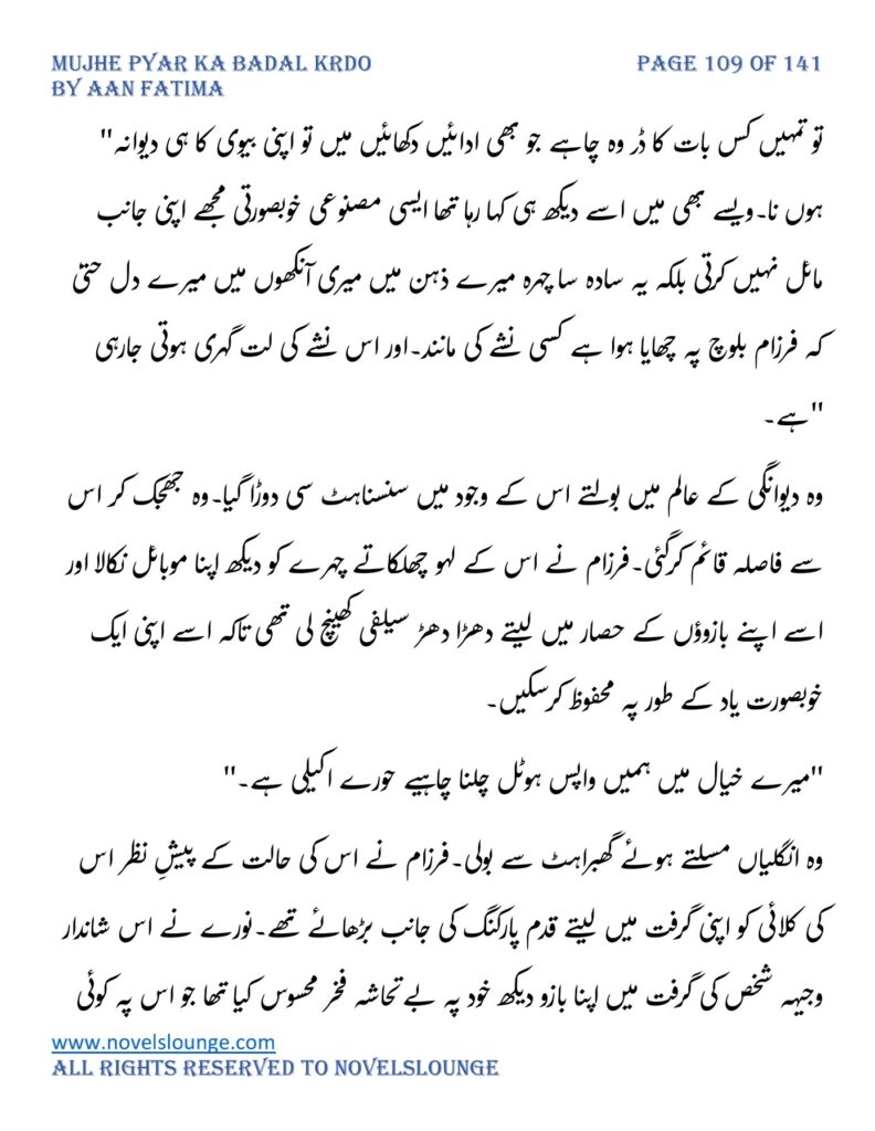 “واہ یہ کیسی محبت تھی جسے پالینے کے بعد اس کا چھونا بھی ناگوار گزرنے لگا اور تمہیں کیا لگتا ہے تم چیونٹی جتنی مجھے انکار کرو گی اور میں تمہارے حکم کا غلام بن جاؤں گا۔مجھے انکار کرو گی تم فرزام بلوچ کو انکار کرکے تم اپنی موت کو دعوت دے رہی ہو۔کون ہو تم۔کیا حیثیت ہے تمہاری۔جواب دو مجھے۔”