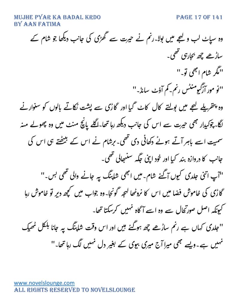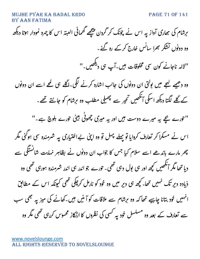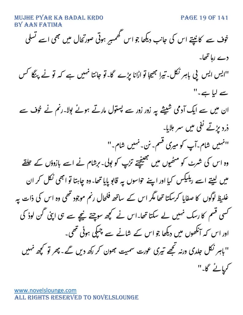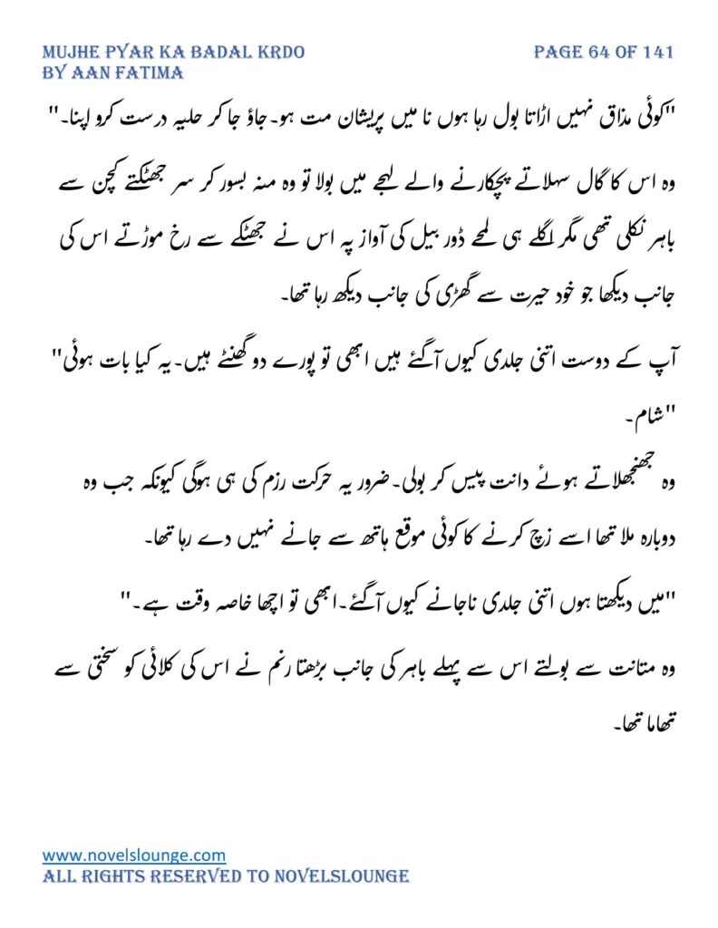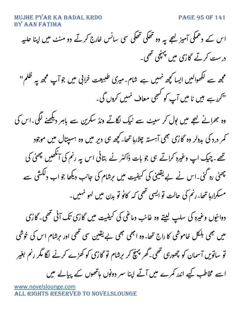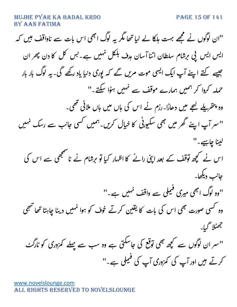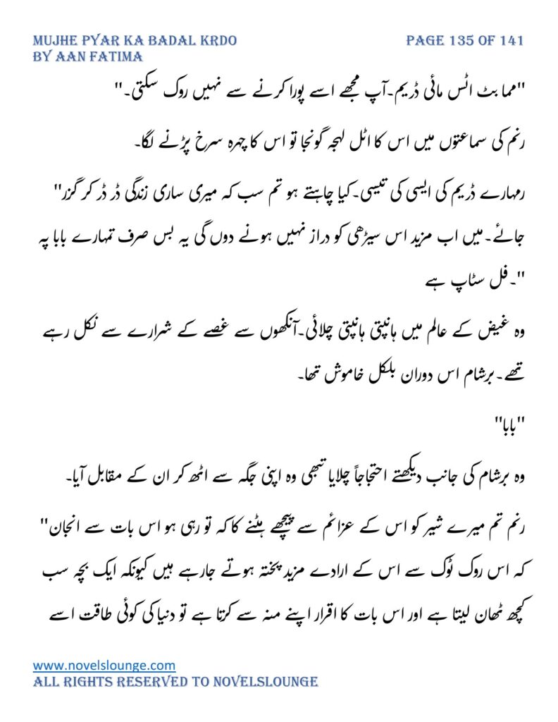“واہ یہ کیسی محبت تھی جسے پالینے کے بعد اس کا چھونا بھی ناگوار گزرنے لگا اور تمہیں کیا لگتا ہے تم چیونٹی جتنی مجھے انکار کرو گی اور میں تمہارے حکم کا غلام بن جاؤں گا۔مجھے انکار کرو گی تم فرزام بلوچ کو انکار کرکے تم اپنی موت کو دعوت دے رہی ہو۔کون ہو تم۔کیا حیثیت ہے تمہاری۔جواب دو مجھے۔”