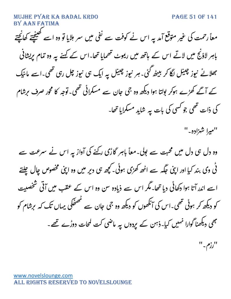 وہ اس کے ہاتھوں کا سلگتا لمس اپنی کلائی پہ محسوس کرتے بدک کر اس سے فاصلہ قائم کرتے وحشت ذدہ سی روتے روتے چلائی۔سرخ آنکھوں میں ایک قہربرپا تھا جو اس کے کافی رت جگوں کی عکاسی کررہا تھا۔فرزام نے پھیکے پڑتے چہرے سمیت سرخ عروسی جوڑے میں ملبوس اس لڑکی کو دیکھا جو کبھی اس کے محبت کی دعویدار تھی اور جب وہ اسے اس کی پسند کو ملحوظِ خاطر رکھتے اسے اپنا چکا تھا تو اب اسے اس کے چھونے سے بھی گھن آرہی تھی۔اس کے وجود میں ایک سیکنڈ میں غصے کا ابال اٹھا۔وہ بھلا کیونکر خود کی اتنی توہین برداشت کرتا۔
